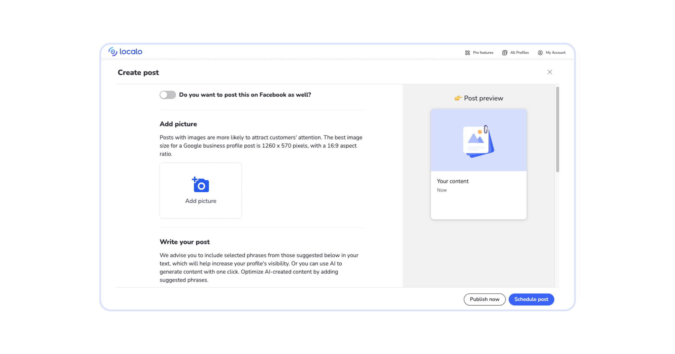 If you don’t know how to create a valuable and optimal posts for your business on Google, you can use the guidelines in the audit of your business in Localo. These will tell you how long your post should be and what words you should use in it to grow your business on Google best. You can also schedule several posts at once, which will publish themselves on the days and times you set.