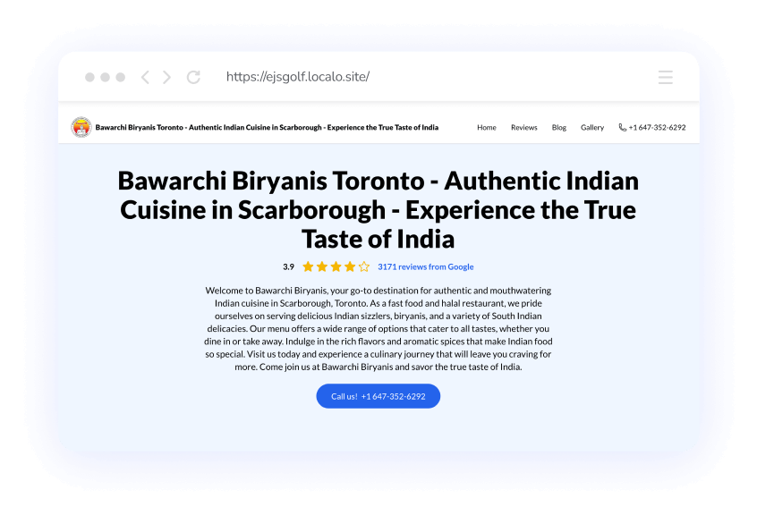 Stwórz profesjonalną stronę, która przyciąga lokalnych klientów, w zaledwie kilka kliknięć. Nasz darmowy kreator stron wykona całą ciężką pracę za Ciebie—automatycznie pobierając informacje z Twojego Profilu Firmy w Google i tworząc kompletną witrynę z Twoimi treściami, zdjęciami i opiniami klientów. Wiedza techniczna nie jest wymagana.