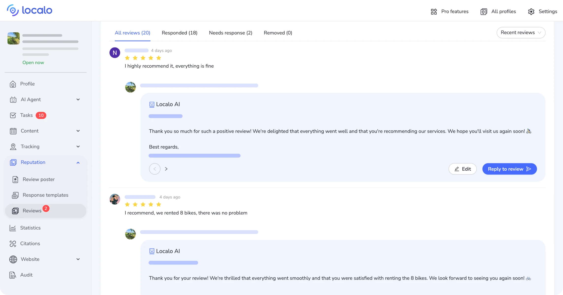 Vereinfachen Sie Ihr Bewertungsmanagement Bewertungen auf mehreren Plattformen zu verwalten kann zeitaufwändig sein. Tools wie Localos Bewertungsmanagement-Software helfen Ihnen, Bewertungen von einem zentralen Dashboard aus zu überwachen, zu beantworten und zu verfolgen, um sicherzustellen, dass Sie nie eine Gelegenheit verpassen, sich mit Kunden zu engagieren.