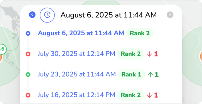 Trzymaj rękę na pulsie śledząc pozycje lokalnych biznesów na interaktywnej mapie. Sprawdzaj, gdzie są widoczne, a gdzie tracą klientów na rzecz konkurencji.