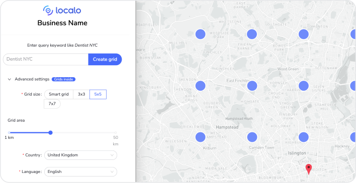 Badaj obszary od 1km do 50km z siatkami od 9 do 49 punktów badawczych. Umieść centrum lokalizacji gdziekolwiek chcesz, nie tylko w lokalizacji firmy.