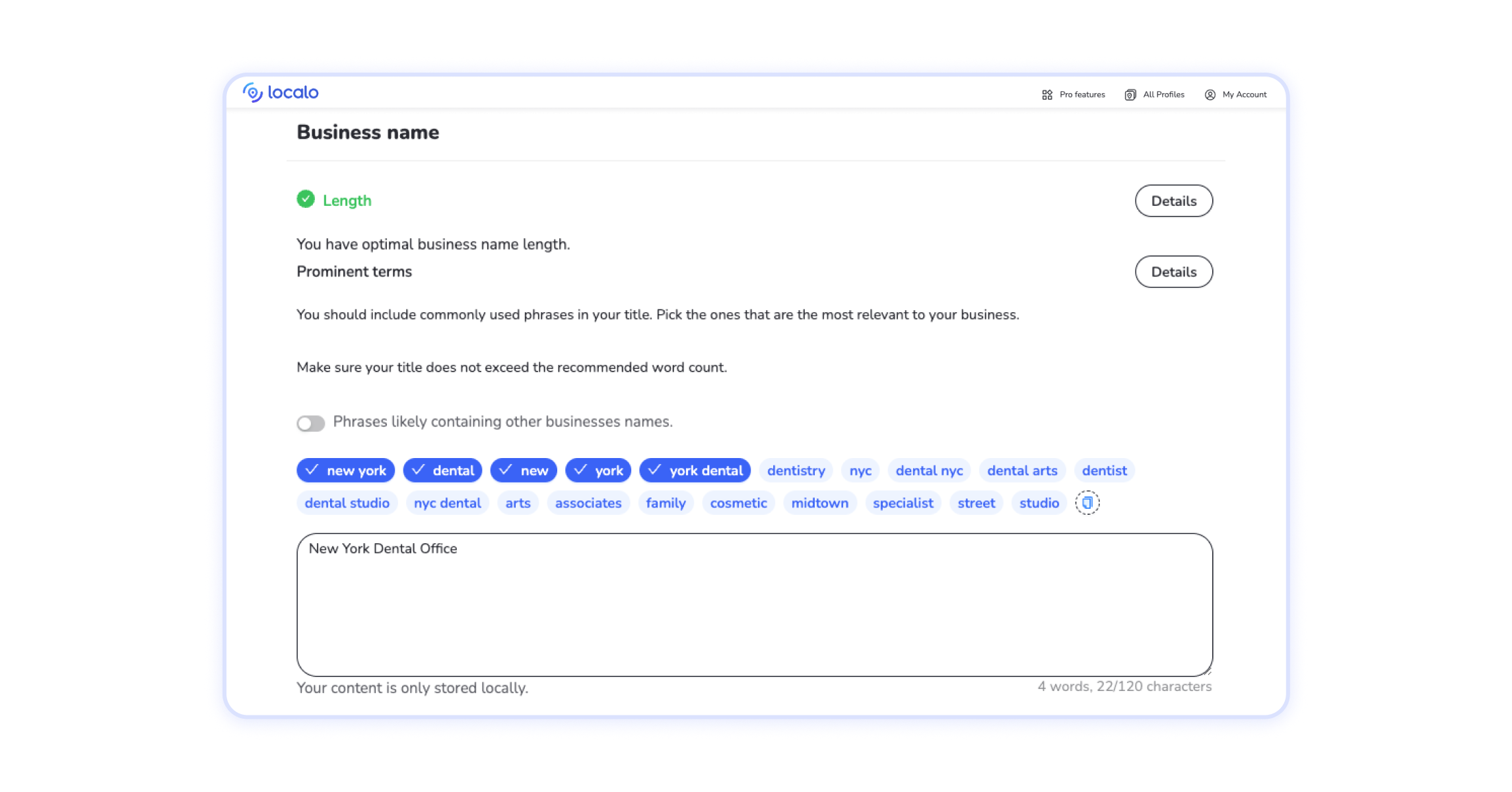 A continuación encontrará las palabras sugeridas que puede utilizar para crear su título. A continuación, compruebe si el que acaba de escribir tiene la longitud óptima y contiene todos los términos necesarios que se ajustan a su negocio. Si ya tienes un título preparado, cópialo y sustitúyelo en tu perfil de empresa de Google.