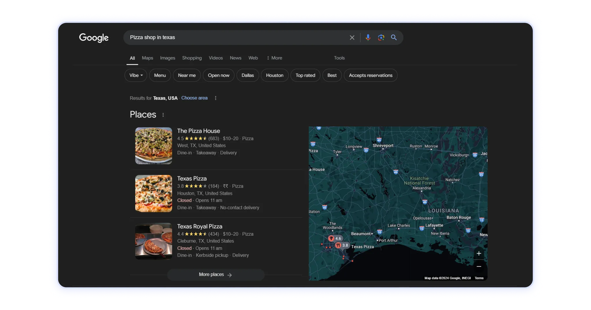 Así es como aparece la ficha de perfil de empresa de Google para las pizzerías de Texas, lo que hace que el SEO local sea importante: