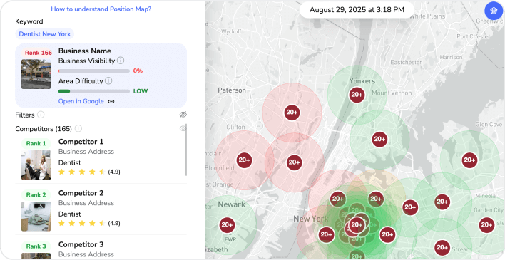Generate visibility maps showing prospects buried on page 3 while competitors occupy top positions 1-20. Spot missing website links in Google Business Profiles immediately.