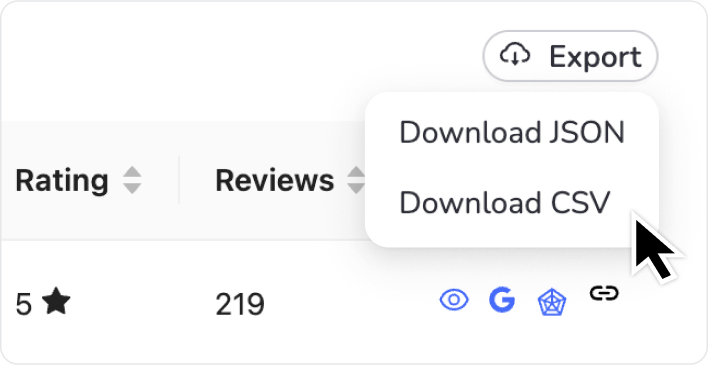 Export your entire prospect list as CSV or JSON with rankings, reviews, and all data points you need. Upload them directly to your CRM or email platform.