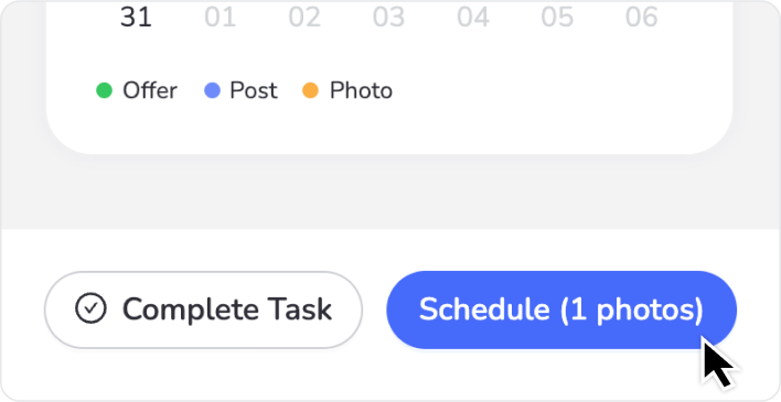 Adicione fotos, escreva posts e otimize descrições sem nem trocar de ferramentas. Marque como completo quando terminar.