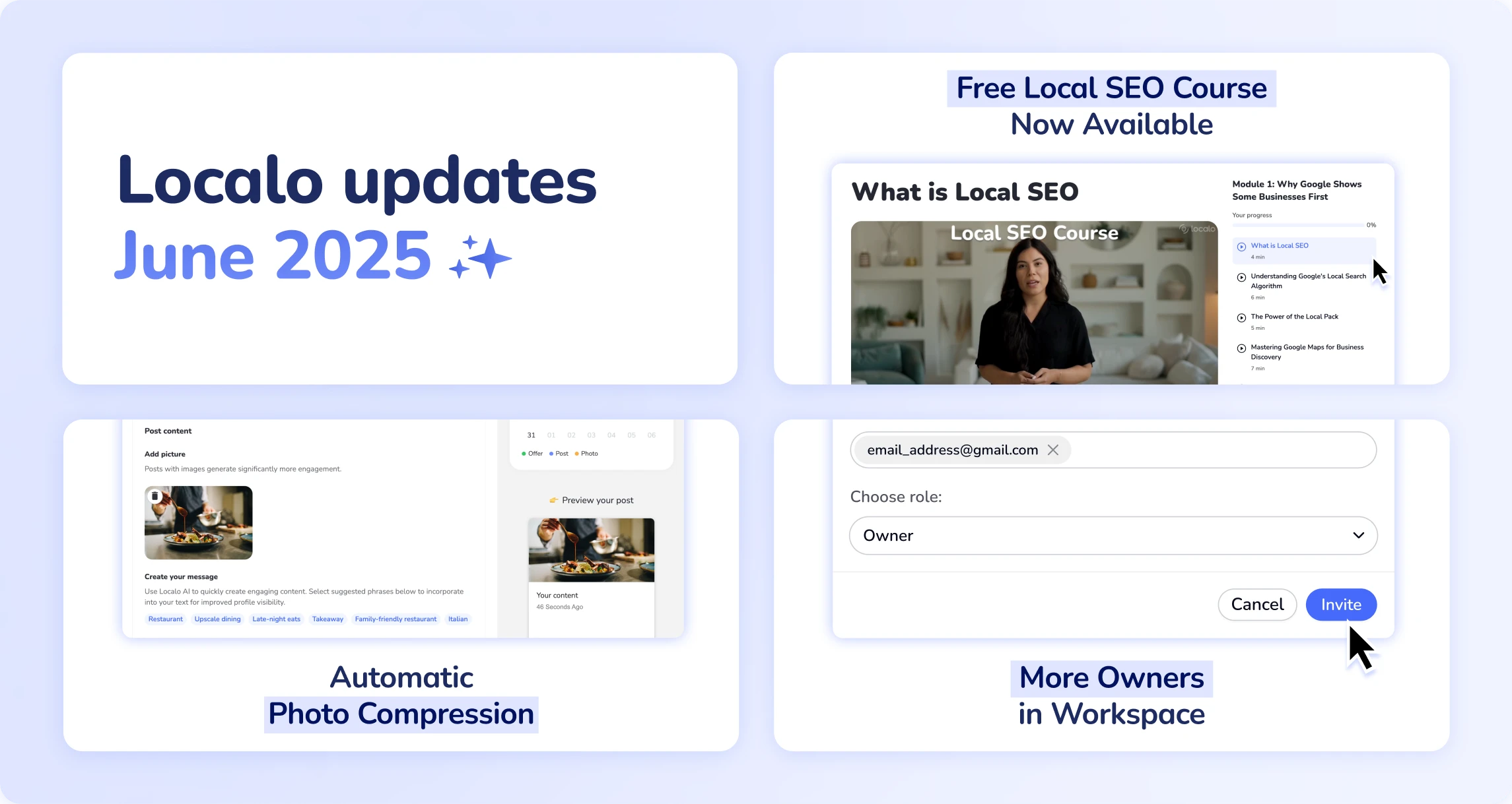 Free local SEO course, better team management and automatic photo compression.